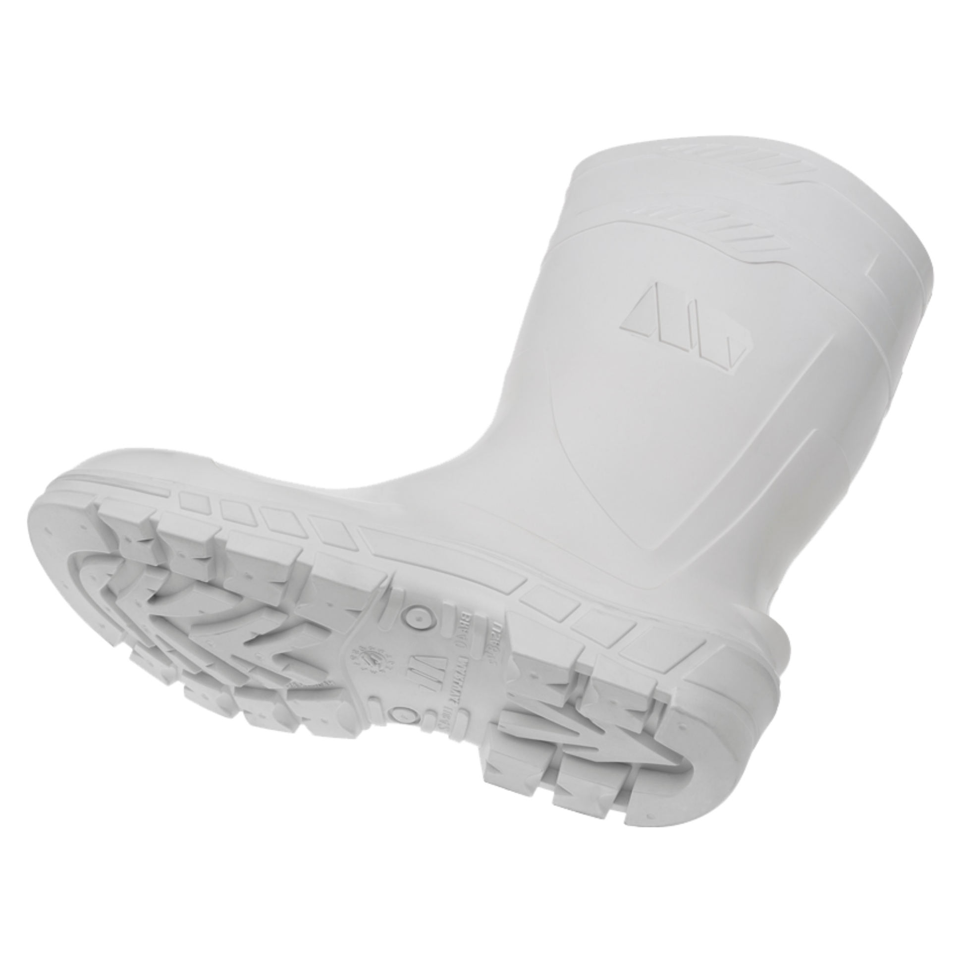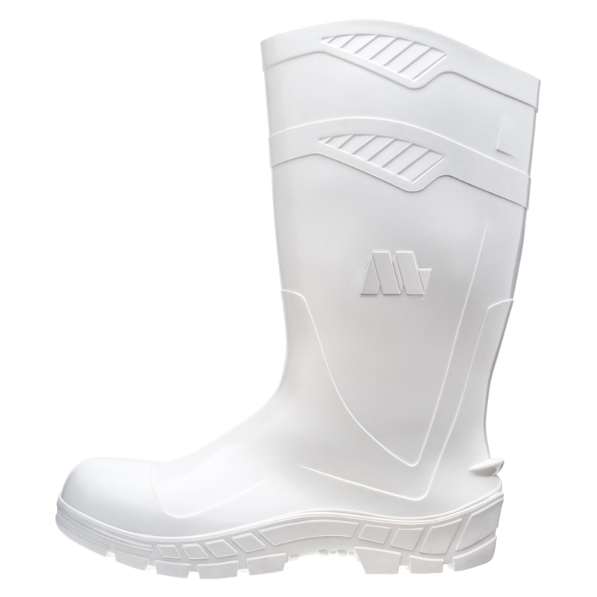 Bota de Seguridad fabricada en (PVC) color blanco con caña alta de 32 cm, impermeable de fácil limpieza. Posee puntera de acero, forración interna y suela en PVC con tecnología full grip antideslizante. Su diseño es bajo estándares ergonómico por eso es super ligera y cómoda, ideal para largas jornadas de pie.