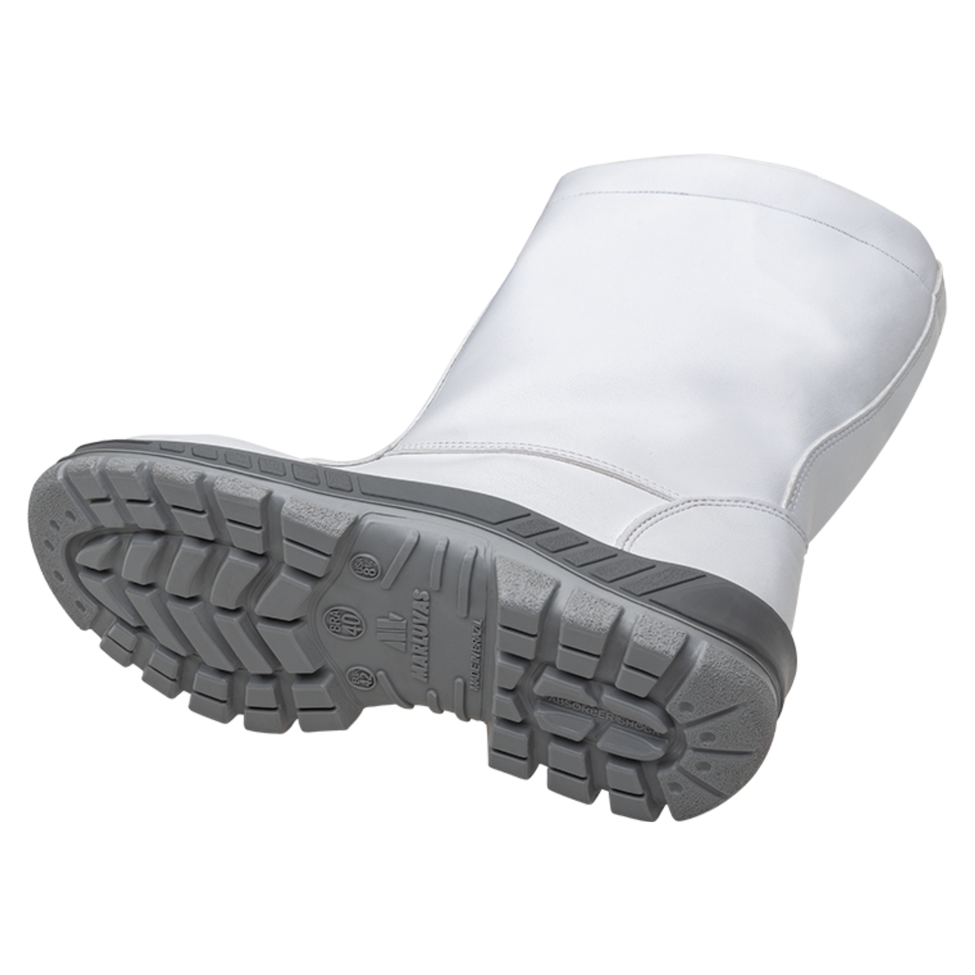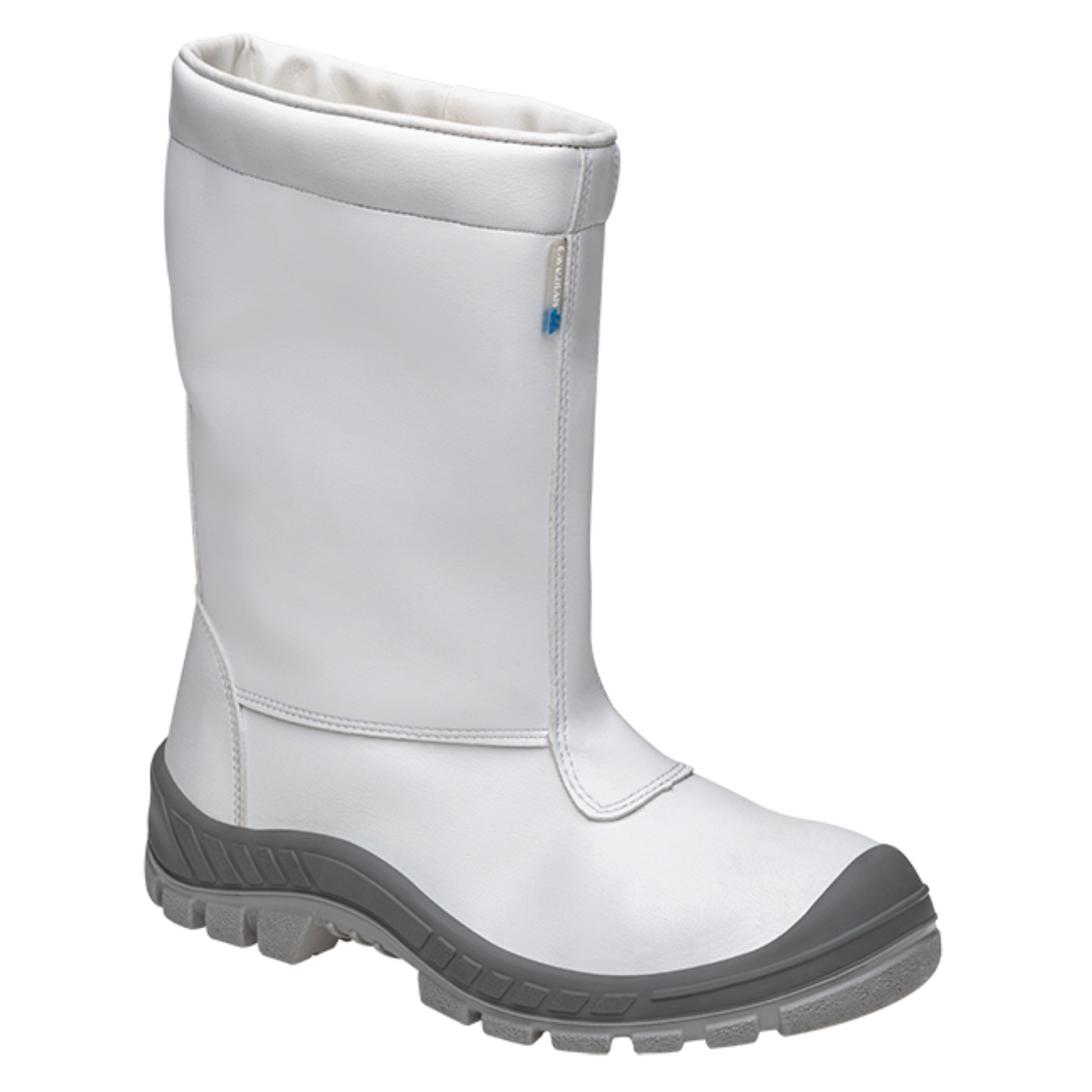 Bota caña alta, fabricada en microfibra color blanco, con forro interno de lana que permite mantener la temperatura óptima del pie en entornos laborales de bajas temperaturas como cuartos fríos y de congelación. Cuenta con puntera de composite ultrarresistente y suela de PU antideslizante especial para ambientes húmedos, suela resistente a hidrocarburos y con sistema absorción de energía en el talón.